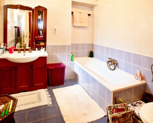 Два балкона, стоянка в саду на две машины, высота потолков в помещениях общей площадью 139 м2: 4 м; в квартире 53 м2: 2,7 м; в полуподвальном помещении: 3 м.