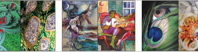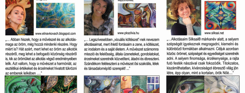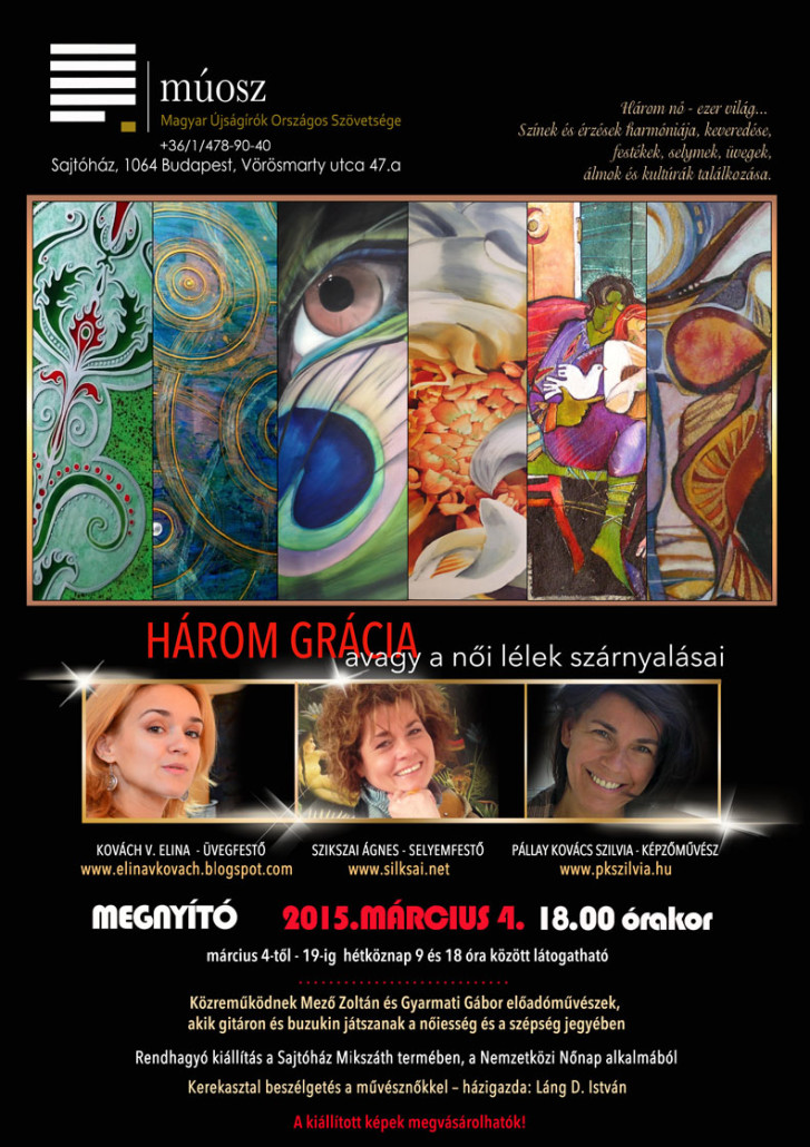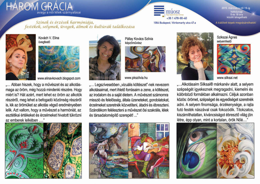 Színek és érzések harmóniája, keveredése, festékek, selymek üvegek, álmok és kultúrák találkozása… Vásznak, kendők, csillogó üvegfelületek kínálnak kivételes alkalmat a három gráciának, hogy a nagyvilág elé tárják képzeletük elragadó szülötteit.