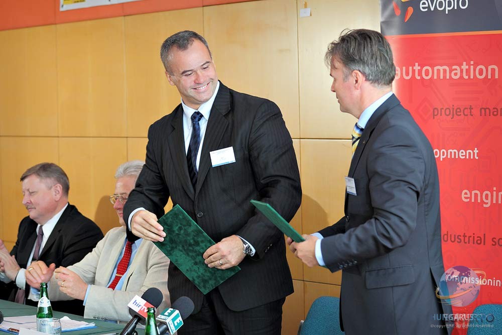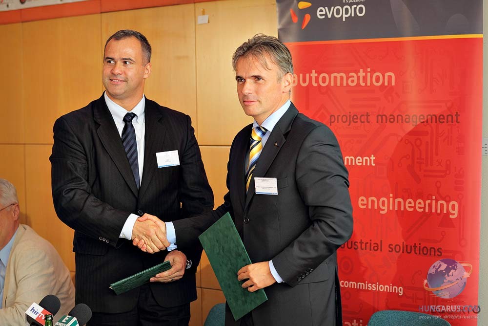 Фотография с прессконференции. Договор подписан, рукопожатие сторон.