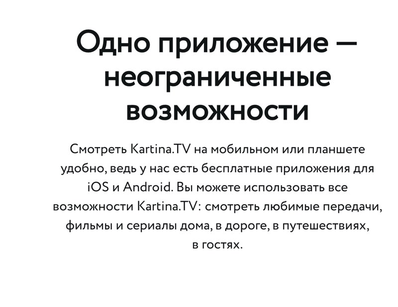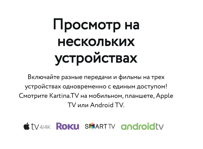 Kartina.TV — это сервис, с которым удобно смотреть русское телевидение, фильмы и сериалы. Зрители выбирают наш сервис за следующие возможности и преимущества: